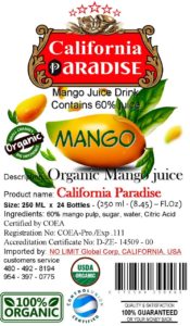 High quality gourmet organic nectar Mango Juice USDA certified 100% No added preservatives